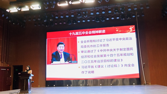张梅报告主题是《扎实学习会议精神汇聚“十四五”奋斗力量》。她从五个方面解读党的十九届五中全会精神:一是会议召开背景;二是会议主要成果;三是《建议》起草情况;四是《建议》主要内容;五是《建议》核心要义,对会议精神进行了详细的阐释。最后,她强调:在新时代新发展阶段,必须认真学习贯彻新发展理念,才能构建事业发展新格局。张梅结合自己的学习体会和研究成果、深入浅出的讲解,获得党员和教职工们的一致好评。